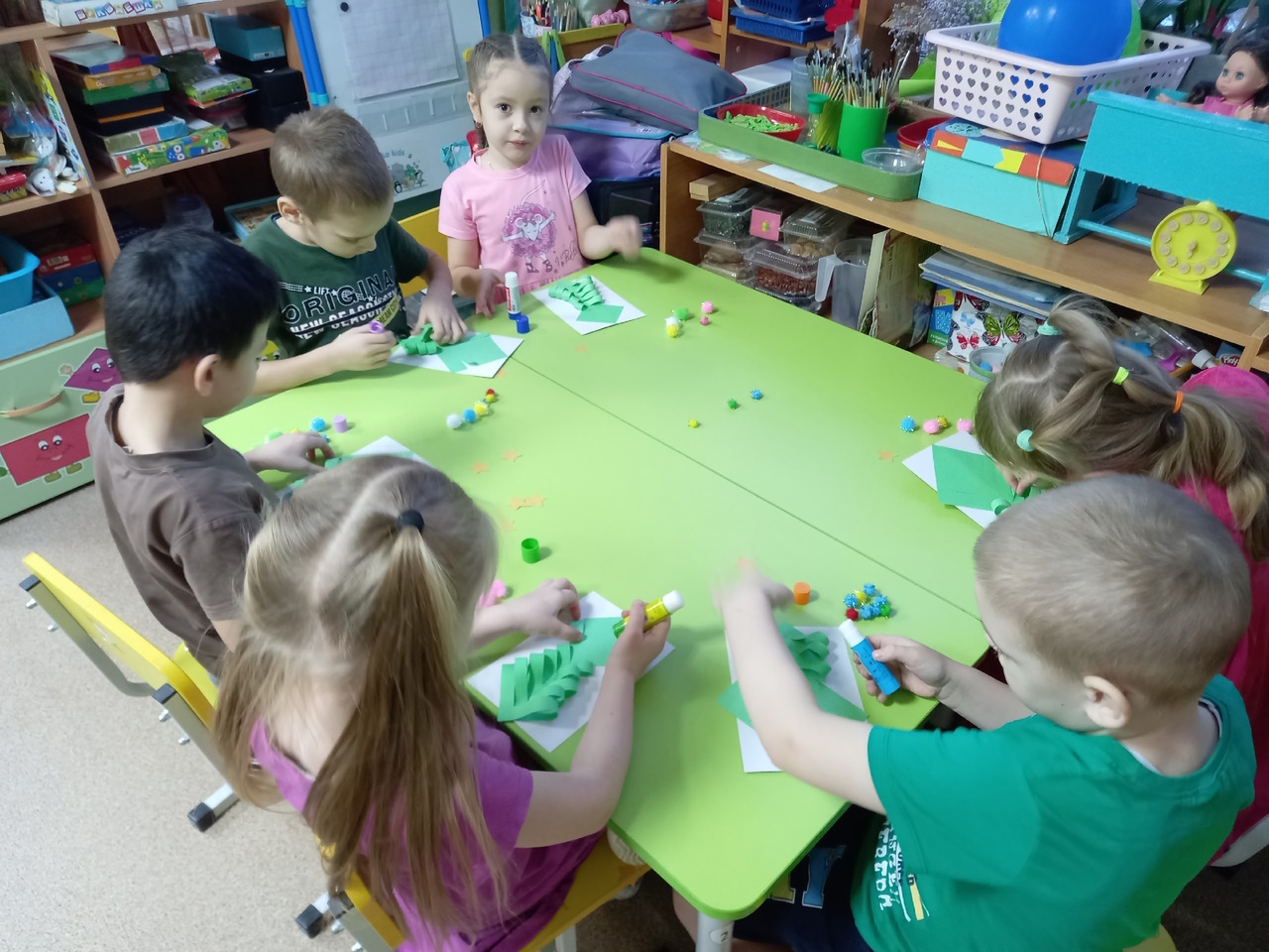 Затем с помощью цветной бумаги и разноцветных помпончиков ребята создавали яркие открытки - волшебные новогодние елочки. Занятие провела специалист Центральной детской библиотеки в рамках работы арт-студии развития детей «Курочка Ряба».